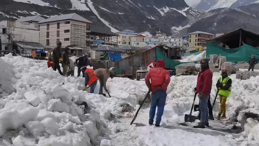 केदारनाथ पैदल मार्ग से लेकर धाम तक श्रमिकों द्वारा रास्ते में जमी बर्फ से हटाई गई।