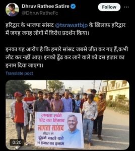 हरिद्वार में त्रिवेंद्र सिंह रावत के खिलाफ केवल धरातल पर ही नहीं, बल्कि सोशल मीडिया पर भी विरोध की लहर देखने को मिल रही है। ट्विटर पर Dhruv Rathi Satire नामक बड़े अकाउंट से एक वीडियो पोस्ट किया गया है, जिसमें स्थानीय लोग प्रदर्शन करते हुए नजर आ रहे हैं। वीडियो में यह कहा जा रहा है कि “हमारे लापता सांसद को ढूंढकर लाने वाले व्यक्ति को दस हज़ार रुपए का इनाम दिया जाएगा।” यह वीडियो वायरल हो गया है और इसे लेकर स्थानीय लोगों में और भी आक्रोश बढ़ गया है।