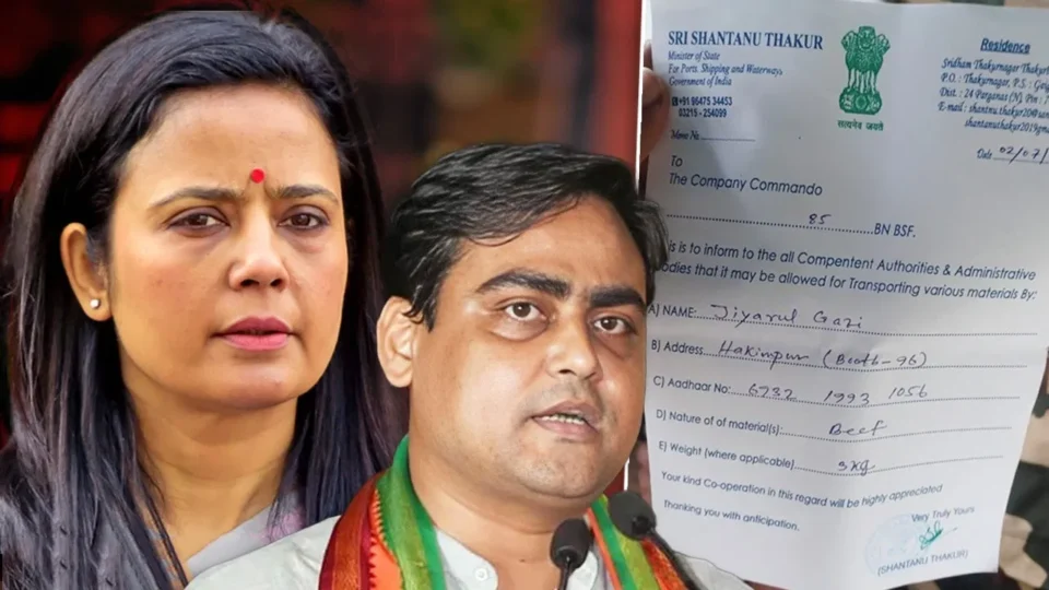 पश्चिम बंगाल की कृष्णा नगर सीट से TMC सांसद महुआ मोइत्रा ने केंद्रीय मंत्री शांतनु ठाकुर पर गंभीर आरोप लगाए हैं. शांतनु ठाकुर की ओर से जारी किए गए एक पास, जिसमें BSF से कहा गया था कि पासधारक को बीफ ले जाने की इजाजत दी जाए. इसी पास ने बंगाल की सियासत में भूचाल ला दिया है.